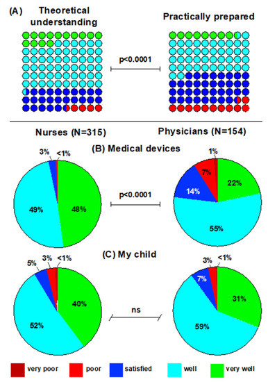 Self-perceived theoretical and practical competence, skills in using medical devices and confidence in the institutional quality of acute care. Participants from both professional groups were much more likely to state they felt well or very well prepared to manage life-threatening situations in theory than in practice (A). Nurses more frequently than physicians felt well or very well trained to operate medical devices in their work environment (B). Both professional groups felt safe to have their own child cared for at the hospital in which they were working (C).