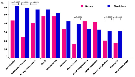 Perceived training needs in twelve specific areas and clinical scenarios. The bars depict the percentage (Oy axis) of nurses and physicians wishing to train the listed skills (Ox axis). When a significant difference was detected between nurses and physicians, the corresponding p-value is provided. The absence of any sign above the bars implies that no statistically significant difference between nurses and physicians was detected. Physicians, significantly more often than nurses, sought training for arrhythmias, airway management, multisystem trauma, head trauma, severe dehydration management and treatment of a child with acute meningitis. Physicians (blue bars): arrhythmias (p < 0.0004), multisystem trauma (p < 0.0014), airway management (p < 0.003), shock (p < 0.0043) and cardiac arrest (p < 0.03) were significantly more often cited than head trauma or the following depicted skills. Nurses (red bars): shock (p < 0.0001), cardiac arrest (p < 0.0001), arrhythmias (p < 0.0147), chest compressions (p < 0.0278) and mask ventilation (p < 0.0414) were more often cited than seizures, multisystem trauma, severe dehydration, acute meningitis, head trauma and emergency drugs.