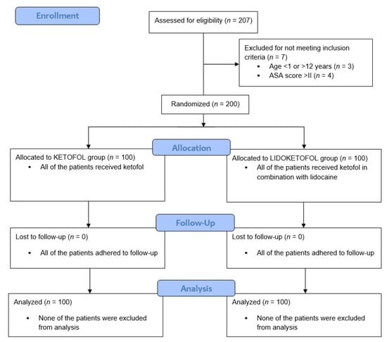 Two hundred pediatric patients who were scheduled for elective short-term surgery, were included in the study. Only the patients scheduled for elective procedures, with a duration less than 60 min in inguino-scrotal region (inguinal hernia repair, orchiopexy, orchiectomy, hydrocele/funiculocele repair, circumcision, hypospadias surgery) were included in study. The study has been conducted from June 2020 until December 2020 in the University hospital of Split, Croatia. Inclusion criteria were previously healthy children aged 1–12 years with an American Society of Anesthesiologists status (ASA) of I and II who underwent short-term surgery. Exclusion criteria were children outside the specified age range, children with ASA III-V, children with comorbidities and children with incomplete data during follow-up. Out of the patients that were included, 100 were in the ketofol group and 100 in the lidoketofol group. Legal representatives of all patients signed an informed consent. The flow chart diagram of the study is shown in Figure 1. Study protocol was approved by the Ethics Review Board of our hospital (reference number 2181-147-01/06/M.S.-20-12, Date of approval: 15 June 2020). Study was registered in ClinicalTrials.gov registry under identifier NCT04467424.