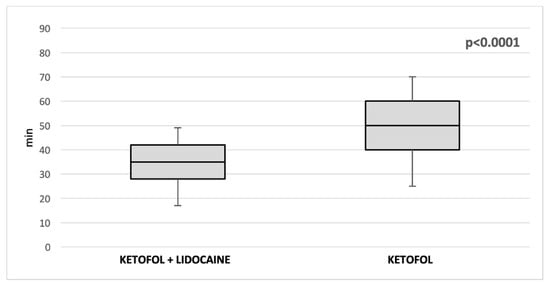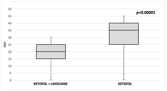 Length of stay in the PACU was significantly shorter (p < 0.00001) in the ketofol and lidocaine group (20 min; IQR 20, 25) than in the ketofol group (35 min; IQR 30, 40) (Figure 4). Vomiting was observed in one patient in each group. One patient out of both groups presented with signs of mild laryngospasm. In no way did any of the patients show signs of propofol-related infusion syndrome (PRIS).