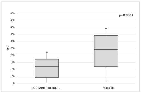 No patient had hemodynamic values exceeding 20% of pre-anesthetic values. Anesthesia duration (35 min (IQR 28, 42) vs. 50 min (IQR 40, 60); p < 0.00001) (Figure 2) and extubating times were significantly shorter (120 s (IQR 41.5, 170) vs. 240 s (IQR 120, 340); p < 0.00001) (Figure 3) in lidoketofol group. In the lidoketofol group the consumption of fentanyl (2.1 µg/kg (IQR 2, 2.8) vs. 2.3 µg/kg (IQR 2, 3); p < 0.0056) and propofol (6.6 mg/kg (IQR 4, 7.5) vs. 7.6 mg (IQR 5, 10.5; p < 0.032) per kg were significantly lower.