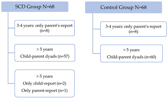 SCD group included sixty-eight children and adolescents. For children above 5 years a total of 57 parent–child pairs were studied; two reports were only answered by the child and one was only answered by parents (Figure 1).