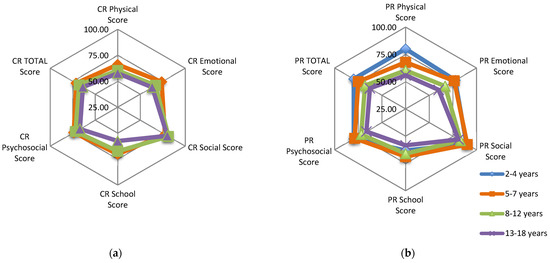 Child self-report (CR) includes age groups 5–7, 8–12, and 13–18 years. The parent proxy report (PR) includes ages 2–4 (toddler), 5–7 (young child), 8–12 (child), and 13–18 (adolescent) and assesses parent’s perceptions of their child’s HRQL. The items of each form are essentially identical, differing in developmentally appropriate language and first or third person. The instructions ask how unpleasant each item has been during the past month. A 5-point Likert response scale is used across child self-report for ages 8–18 and parent proxy report (0 = never a problem; 1 = almost never a problem; 2 = sometimes a problem; 3 = often a problem; 4 = almost always a problem). Children aged 5–7 years use a simplified, 3-point rating scale (0 = not at all a problem; 2 = sometimes a problem; 4 = a lot of a problem), with each response choice anchored to happy, neutral and sad faces scale. Items are reverse scored and transformed to a 0–100 scale, so that higher PedsQL scores indicate better HRQL [15,16,17]. Complete case analysis was used.