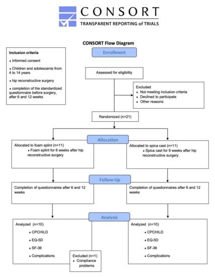 Background: Surgical hip joint reconstruction may be the method of choice for children and adolescents with developmental dysplasia of the hip (DDH), as well as neurogenic dislocation of the hip (NDH) and Legg–Calvé–Perthes disease (LCPD). Following pelvic surgery, immobilization using a spica cast is considered to be the gold standard, despite the fact that casting may cause complications, such as hygienic problems, skin lesions, neurological deficits, and rigidity of the adjacent joints. An alternative for postoperative immobilization is a foam splint. The purpose of this randomized controlled trial was to compare spica cast and foam splint immobilization after hip reconstruction in children and adolescents with DDH, NDH, and LCPD. Methods: In a prospective randomized clinical trial, children and adolescents (age: 4–14 years), who received hip reconstructive surgery (osteotomy of the ilium and proximal femur, open reduction, soft tissue techniques) for DDH, NDH, and LCPD were included. Patient recruitment, group allocation, surgery, and aftercare were carried out in a department for orthopaedic surgery in Central Europe. Standardized questionnaires SF-36 (Short Form-36), EQ-5D (Euro Quality of Life 5D and CPCHILD (Caregiver Priorities and Child Health Index of Life with Disabilities) were gathered before, six, and twelve weeks after surgery from each patient. Group one received a spica cast and group two a foam splint for a period of six weeks postoperatively. There was no difference in surgical treatment. Results: Twenty-one out of thirty planned patients were enrolled in the study. One patient had to be excluded because of a lack of compliance. All quality of life (QOL) scores showed a significant reduction at the 6-week follow-up compared to the preoperative assessment. After twelve weeks, the scores came back close to the preoperative values. A significant reduction was seen in the spica cast group pre- vs. postoperatively for the variables CPCHILD (81% vs. 64%, p = 0.001), EQ-5d (65% vs. 45%, p = 0.014), and SF-36 (85% vs. 74%, p = 0.004). The corresponding values for the foam splint group also presented a reduction for all scores, but without statistical significance. Complications occurred in five cases. Conclusions: Recent retrospective studies suggest that foam splint immobilization after hip reconstruction surgery is a safe and feasible method, promising fewer complications compared to spica casting. The preliminary results of this prospective randomized clinical trial show an improvement of the scores when using a foam splint compared to the conventionally used spica cast. Benefits for the patients may be fewer adverse events and no need to undergo a second round of anaesthesia for recasting. Data suggest higher patient and caretaker satisfaction in the foam splint group.