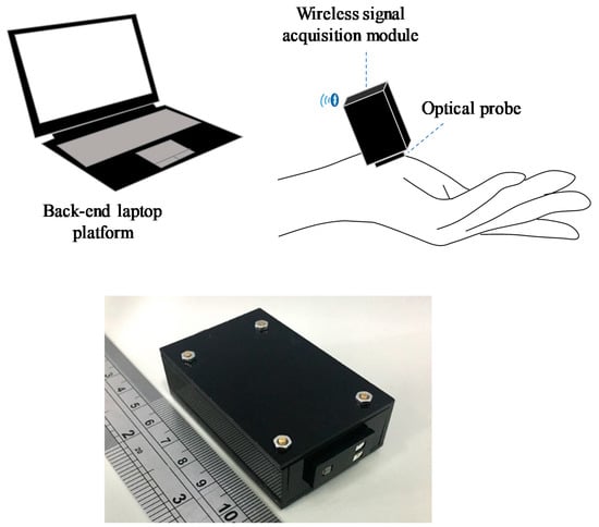 The basic scheme of the proposed optical device for evaluating the tissue of KD patients and controls is illustrated in Figure 1. It mainly consists of two parts, namely an optical probe and a wireless signal acquisition module. The optical probe contained a multi-wavelength surface mounted device (SMD) light emitting diode (LED) and photodiode (PD) to provide a tri-wavelength (700 nm, 910 nm, and 950 nm) light source and a light detector. The wireless signal acquisition module was designed to drive these LEDs, receive and digitize the reflected light signal, and then transmit the optical signal to the back-end laptop platform wirelessly via Bluetooth. After receiving the optical signal, the back-end laptop platform estimated the hemoglobin concentration and water content in the tissue.