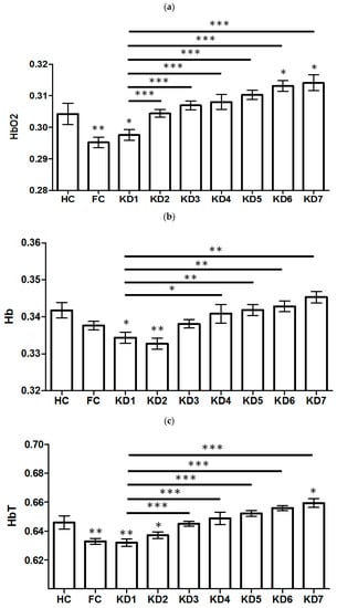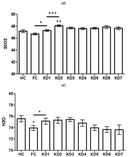 The demographic data of all participants are shown in Table 1. The changes of relative HbO2, Hb, HbT, StO2, and H2O concentrations in different disease stages of KD are showed in Figure 2a–e, respectively. The relative HbO2 of the KD1 group were significantly lower than those of the healthy group (0.298 ± 0.01 vs. 0.304 ± 0.05, p = 0.028), but no significant differences were found with fever group (0.295 ± 0.013, p = 0.26). The HbT concentrations of KD1 group were significantly lower than in the health group (0.632 ± 0.019 vs. 0.646 ± 0.021, p = 0.001) but no significant differences were found with the fever control group (0.633 ± 0.016, p = 0.77). After the acute stage of KD1, both the relative HbO2 and HbT concentrations gradually increased to similar values as the healthy group. The relative Hb concentration of the KD1 group was significantly lower than that of the healthy group (0.334 ± 0.011 vs. 0.342 ± 0.009; p = 0.006), and were still low in KD2, but increased significantly after the KD3 to the KD7 stage (KD 1 vs. KD 4, p = 0.007). The difference of StO2 showed significant lower in fever group (46.678 ± 1.359, KD1 vs. FC, p = 0.009) when compared with the KD1 group (47.246 ± 1.268) and healthy group (47.145 ± 1.047, KD1 vs. HC, p = 0.74). The relative H2O concentration of the KD1 group (75.138 ± 3.937) was significantly higher than that of fever group (73.638 ± 3.508; KD1 vs. FC, p = 0.019) but no significant differences were found with the healthy group (75.560 ± 2.509; KD1 vs. HC, p = 0.640).The same group of children were longitudinally followed over time with KD1 and KD3 (N = 12) and showed significant association in HbT (p = 0.015, paired-sample t test) but not in others. Relative levels of HbO2, HbT, and Hb showed significant differences between KD1 and the health control group, while StO2 and H2O showed differences between KD1 and fever control. The ANOVA analysis in HbO2 (p < 0.0001), Hb (p < 0.0001), HbT (p < 0.0001), StO2 (p < 0.0001), and H2O (p = 0.031) showed significant difference between groups of HC, FC, and KD1-KD7.