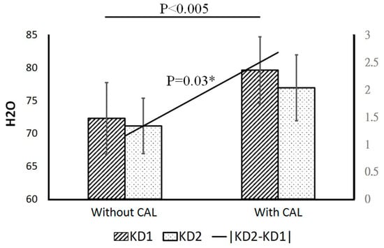 Relationship between coronary artery lesions (CAL) and relative H2O concentration in Kawasaki disease (KD). The relative water concentration was significantly higher in KD with CAL formation (N = 9) than without (N = 24) (p < 0.005) in the KD1 stage. The difference between KD1 and KD2 relative H2O concentration levels also demonstrated significant differences with regard to CAL formation (p = 0.03). (The left y-axis was for the parameters corresponding to different groups, the right y-axis was for the difference between KD1 and KD2). KD1, within one day before IVIG treatment; KD2, after IVIG treatment (within three days). * p < 0.05.