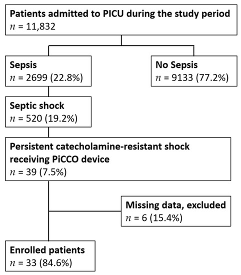 Over the course of the 15-year study period, 11,832 patients were admitted to our PICU, of whom 2699 (22.8%) suffered from sepsis. Septic shock was observed in 520 (19.2%) of the 2699 patients with sepsis. The PiCCO device was inserted for invasive hemodynamic monitoring in 39 children with persistent catecholamine-resistant shock. As six patients had missing data, we finally enrolled 33 patients for further analysis (Figure 1). Among the enrolled children, 72.8% were microbiologically confirmed as having an infection. The bloodstream was the most frequently observed site of infection, with Gram-negative bacteria as the predominant pathogen. The patient survival rate was 45%, and the mortality rate was 55%. Both survival and mortality groups commonly used dopamine and epinephrine as initial vasoactive–inotropic agents. After the PiCCO arrangement, the non-survivors exhibited a significantly higher VIS but a significantly lower MAP, compared with the survivors (p < 0.05).