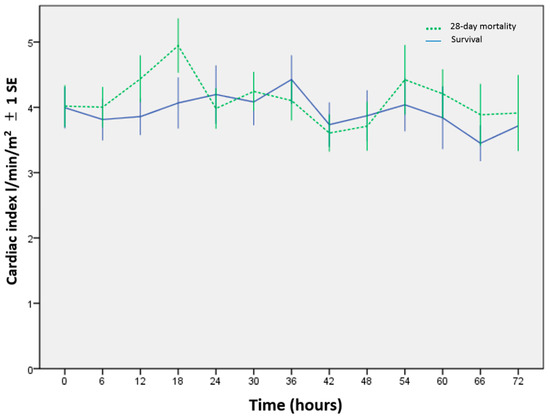 Serial cardiac index (CI) and its variance (mean ± 1 SE bar) after comparing survivors with non-survivors, measured at 6 h intervals.