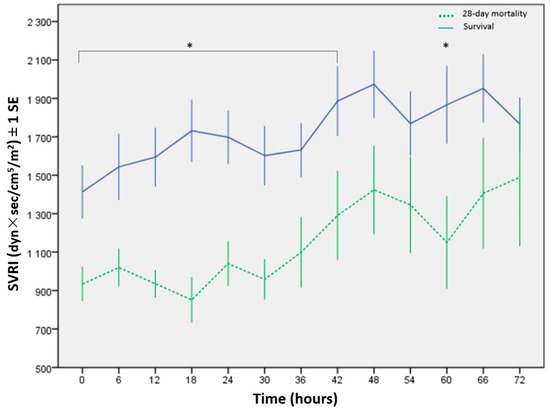 Serial systemic vascular resistance index (SVRI), measured at 6 h intervals. * Statistical significance was set at p < 0.05.