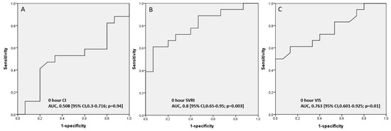 Predicting 28-day mortality at 0 h based on the AUCs of CI, SVRI, and VIS. (A) CI, (B) SVRI, and (C) VIS.