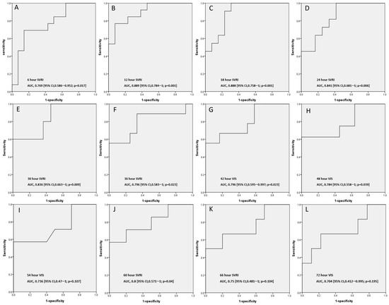 Two cutoff values for SVRI in predicting clinical outcomes with 100% specificity and 100% sensitivity at 6 h intervals.