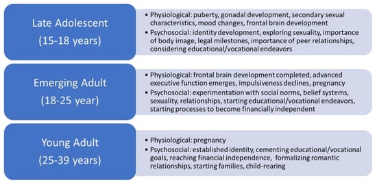 The emerging adult period includes adults aged 18–25 years as described by Arnett in 2000 []. In this age range, advanced executive function/decision-making typically emerges while impulsiveness declines []. Frontal brain development is completed near 25 years of age []. Socially, young adults are experimenting with social norms, religious or spiritual beliefs, sexuality, and relationships []. They are also exploring their career and educational paths []. In general, this age group still receives some financial support from their parents or other family, but they are starting to establish paths toward their own financial independence []. Additionally, pregnancy is more prevalent in this age group than the late adolescent group.