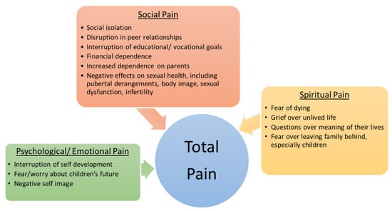 In the 1960s, Dame Cecily Sanders, the founder of modern hospice, described the concept of total pain, which posits that suffering and pain is not just physical but rather it also includes psychological/emotional, social, and spiritual factors []. This model can be applied to adolescents and young adults living with cancer. As previously mentioned, they experience physical and non-physical pain. Cancer conflicts with the normal progression of psychological/emotional, social, and spiritual development, thus leading to total pain in this vulnerable group. See Figure 2 for a summary of the psychological/emotional, social, and spiritual aspects of total pain in AYAs.
