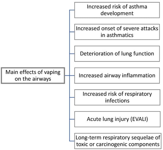 EC use can also undermine the way the human airway defends itself against infectious agents. When attacked, the airway employs three basic mechanisms to maintain its integrity: mucociliary clearance, cough, and innate immunity. Vaping increases the risk of respiratory infections by downregulating these mechanisms, since it impairs the function of the cilia, reduces the sensitivity of cough receptors, impairs neutrophil and alveolar macrophage function, and modifies the expression of genes and molecules involved in immune reactions [45,46,47,48]. Although these studies were not performed on asthmatic airways, infections are a well-known trigger of asthma exacerbations [49], and vaping may act as a mediator. There is a positive relationship between vaping and an enhanced risk of asthma development according to studies performed in children up to the age of 18 years. EC use increases the probability of an asthma diagnosis in adolescents [50,51,52] and has been found to be an independent risk factor for asthma, after controlling for various covariates [53,54,55]. Vaping also increases the asthma prevalence among high school students [56,57], and, according to an opinion article, the culprit may be the airway irritants and toxicants contained in EC flavorings and aerosols [58]. Cho et al., in a cross-sectional web-based study, found that adolescent EC users had a greater risk for school absenteeism due to asthma (high adjusted odds ratio for severe asthma) [50]. Interestingly, another school-based cross-sectional study investigating the effects of secondhand EC exposure on asthma showed that asthmatic youths have higher odds of reporting an asthma attack in the previous year when exposed to secondhand EC vapor [59].