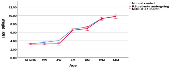 As shown in Figure 1, in the group undergoing MDO at <1 month, the weight of RS patients was decreasing significantly compared to the normal control group (3.29 ± 0.46 kg versus 3.93 ± 0.26 kg, p < 0.001 for the weight at the timing point of MDO and 4.03 ± 0.44 kg versus 6.01 ± 1.41 kg, p < 0.001 for the post-discharge weight). At the timing point of distractor removal, the weight of RS patients was close to that of the normal controls (6.81 ± 0.93 kg versus 7.18 ± 0.61 kg, p = 0.012). At aged one year, patients reached the normal weight compared to the normal controls (9.34 ± 0.99 kg versus 9.55 ± 0.45 kg, p = 0.254).
