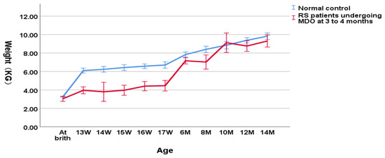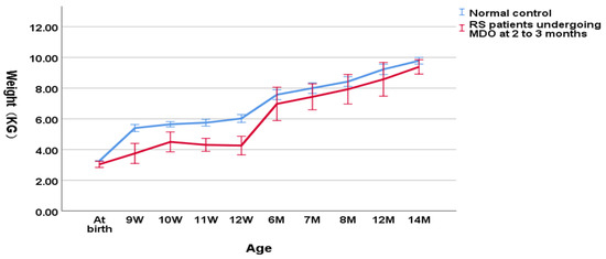 As shown in Figure 4, in the group undergoing MDO at 3 to 4 months, the weight of RS patients was still significantly lower relative to the normal controls (3.90 ± 0.79 kg versus 6.31 ± 0.33 kg, p < 0.001 for the weight at the timing point of MDO and 4.30 ± 0.79 kg versus 6.63 ± 0.34 kg, p < 0.001 for the post-discharge weight). At the timing point of distractor removal, the weight of RS patients could not reach a normal weight compared to the normal controls (7.36 ± 1.05 kg versus 8.25 ± 0.77 kg, p = 0.004). At aged one year, RS patients finally reached the normal weight compared to the normal controls (9.38 ± 0.29 kg versus 9.83 ± 0.53 kg, p = 0.098).