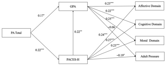 Results of path analysis between learning motivation, PACES-H, GPA, and PA total. Note. * p < 0.05; ** p < 0.01; *** p < 0.001.