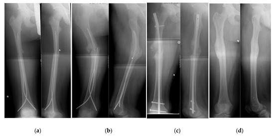 - Canavese, F.; Marengo, L.; Andreacchio, A.; Mansour, M.; Paonessa, M.; Rousset, M.; Samba, A.; Dimeglio, A. Complications of elastic stable intramedullary nailing of femoral shaft fractures in children weighing fifty kilograms (one hundred and ten pounds) and more. Int. Orthop. 2016, 40, 2627–2634. [Google Scholar] [CrossRef]