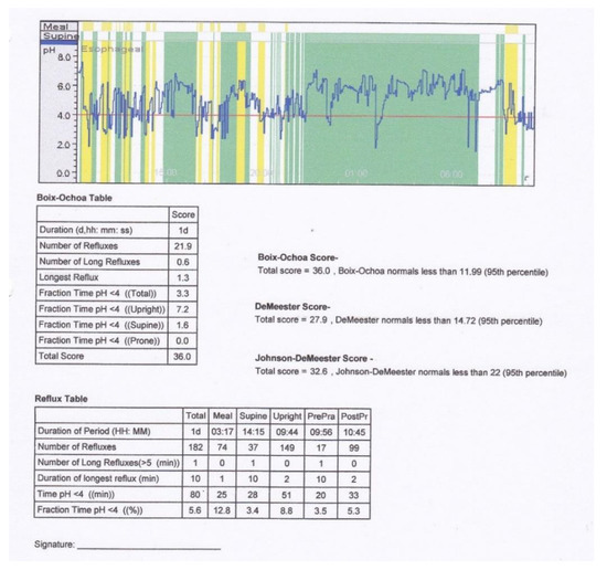 The patients were evaluated for the presence of GER by continuous monitoring during 24 h of the esophageal pH. The Boix-Ochoa score was used to interpret the results as recommended by literature for pediatric age (N < 11.99). This test differentiates the physiological from pathological reflux [9]. We used as device the Medtronic Digitrapper pH 100, SN 37660, with Polygram Net TM pH Testing Application and Kinetics 24 and multi-use catheters ComforTec by Sandhill. The pH-metry is based on the idea that the progression of the acid gastric content in the esophagus during reflux causes a decrease in intraesophageal pH. The method involves measuring the pH in the lower part of the esophagus for a certain period (in our study 24 h) by using an electrode located 5 cm above the cardia and attached to a portable pH-meter with batteries [10,11,12,13,14].