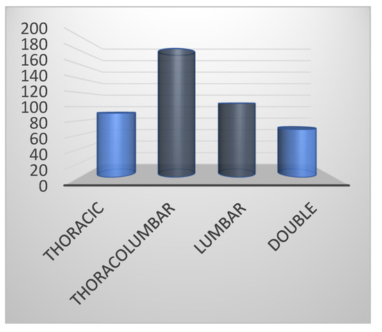 Curve types were: thoracic (n = 91; 20.3%), thoracolumbar (n = 182; 40.8%), lumbar (n = 105; 23.6%) and double (n = 68; 15.3%) (Figure 1).