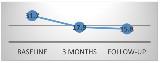 Changes in the CM over time were statistically significant (p for trend <0.0001), with a mean value of 31.75 ± 8.8° Cobb at the start of treatment (t1), 17.91 ± 8.62 SD at 3 months (t2) and 15.87 ± 11.49° Cobb at follow-up (t3). Perdriolle at baseline was 13.20 ± 4.90 SD. (Figure 2 and Figure 3).