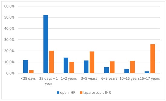 Of the 9718 children with IHR, 18% were females, with a higher proportion of females (38%) in laparoscopic IHR. A total of 74% of all children with IHR were less than two years of age, compared to only 33% of the children with laparoscopic IHR (Table 2). The comparison of the age groups of the children with open and laparoscopic IHR is presented in Figure 1.