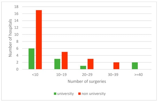 Number of procedures of laparoscopic inguinal hernia repair of university and non-university hospitals in 2019.