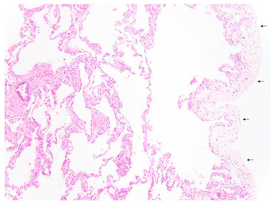 Histology in prematurity-related lung disease. Wedge biopsy sample from a 2-year-old girl born at 32 and 5/7 weeks’ gestational age shows small airway remodeling, smooth muscle proliferation, and enlarged airspaces. The pleura (arrows) were thin and delicate without pathological evidence for thickening. (Hematoxylin and eosin; original magnification, 100×).