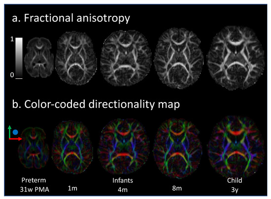 Evolution of DTI maps during development. Fractional anisotropy (a), and color-coded directionality (b) maps are illustrated according to the age—31 weeks of postmenstrual age, at 1, 4, and 8 months of age, and 3 years old. Adapted from ref. [36].