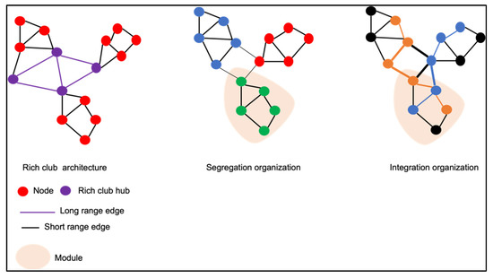 Illustration of a cerebral network according to the graph theory: nodes are connected one over another by edges. Nodes which play a significant role in exchanging information are hubs. Well-interconnected hubs belong to a rich club. In a segregation organization, modules represent networks with dense connections between nodes within the same module but sparse connections between nodes of other modules. In an integration organization, disparate brain modules are well-interconnected.