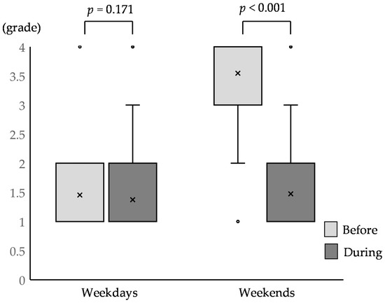 Frequency changes in team practice on weekdays and weekends (n = 99). Data are shown as median values and calculated using the Wilcoxon test. ‘×’ demonstrate the mean value and ‘∘’ demonstrate the outlier. Abbreviations: before, before the COVID-19 pandemic; during, during the first declaration of the state of emergency; grade 1, none; grade 2, <3 h; grade 3, 3–5 h; grade 4, >5 h.