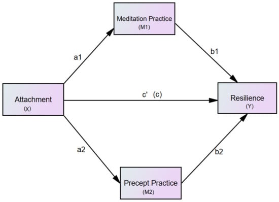 For mediation analysis, the researchers used the methods discussed by Hayes [48] to examine the relationship between attachment (X) and resilience (Y) through meditation (M1). Furthermore, we tested the model when precepts were included as the second mediator (M2) in a multiple parallel mediation model (Figure 1).