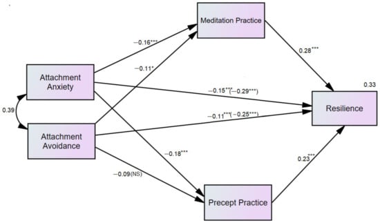Parallel mediation model (n = 453). Indirect effects of attachment anxiety/attachment avoidance on resilience through meditation and precept practice (controlling for covariates). The model is controlled for age, sex, school type, religion, and family income. Standardized effects are presented. The effects on the direct path from attachment to resilience depict the direct effect and the (total effect) * p < 0.05, *** p < 0.001, NS = non-significant.