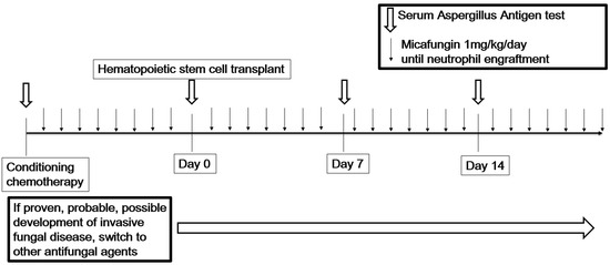 This was a phase II, prospective, single-center, open-label, and single-arm study. This study was approved by the Institutional Review Board of Seoul National University Hospital (No. 1102-038-351), and informed consent was obtained from the parents. This study was registered at clinicaltrials.gov (#NCT01417169). Eligible patients who provided informed consent were administered a single 1 h infusion of micafungin (Astellas Pharma US Inc., Deerfield, IL, USA) at 50 mg/day (1 mg/kg/day for patients weighing <50 kg). Infusion of micafungin was initiated on day 8 of autologous stem cell transplantation (Figure 1).