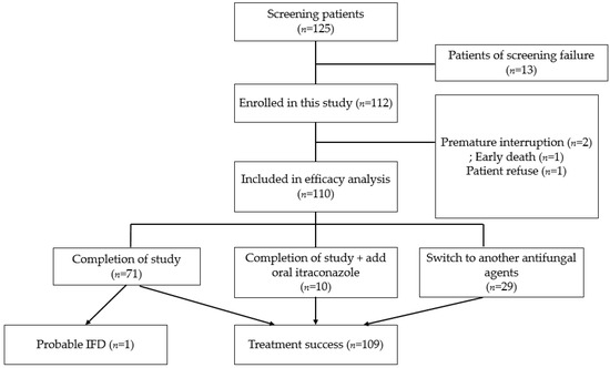 If proven, probable, or possible IFD was diagnosed during the administration of micafungin prophylaxis, the case was recorded as a treatment failure. Another antifungal agent could be administered along with micafungin, or patients could be switched to other antifungal agents. Treatment success was defined as the absence of proven, probable, or possible IFD up to 4 weeks after therapy.
