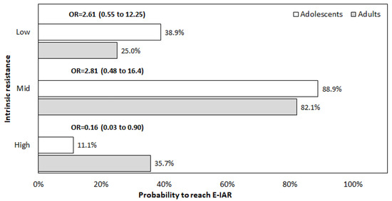 Finally, the proportion of asthmatic adolescents who reached their E-IAR value is reported in Figure 1 for the three simulated regimens. The probability to achieve the E-IAR in asthmatic adolescents was comparable to that of adults at low- and mid-resistance regimens, while it was lower at a high-resistance regimen (OR = 0.16, 95% CI 0.03 to 0.90).