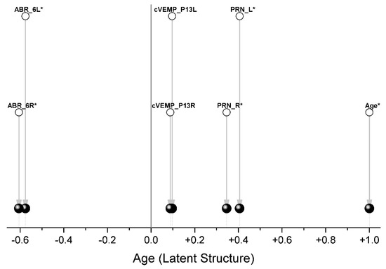 The composition of the blocks of variables is shown in Table 2. Since our task was to rotate the variables describing the indicators (ABR, PRN, cVEMP) by the angle that gives the maximum covariance with age, only one variable (age) was included in block #2. Therefore, after Two-Block PLS analysis, we received only one Latent Structure, which is age (Figure 5).