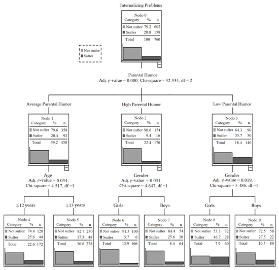 Finally, with intent to ease the interpretation of significant associations observed and the role of both gender and age, a classification tree was made by dependent variable Internalizing Problems, adding independent variables Parental Humor and age and gender groups.