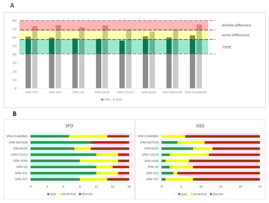 Therefore, 43 children (18 with isolated SPD and 25 with ASD) were recruited and their parents filled out three validated tools questionnaires (see Section 2.2) to assess the psychomotor profiles. The inclusion criteria for the study were as follows: (i) children with SPD or ASD were assessed by a multidisciplinary team, according to DSM-5 and DC:0-5 criteria; (ii) the age of the children had to be between 2 and 5 years; (iii) the absence of major sensory impairments in the child. The exclusion criteria were as follows: (i) children with genetic, neurological, or psychiatric conditions; (ii) children with epilepsy or seizures controlled by pharmacotherapy; (iii) children with parents who do not speak the Italian language.