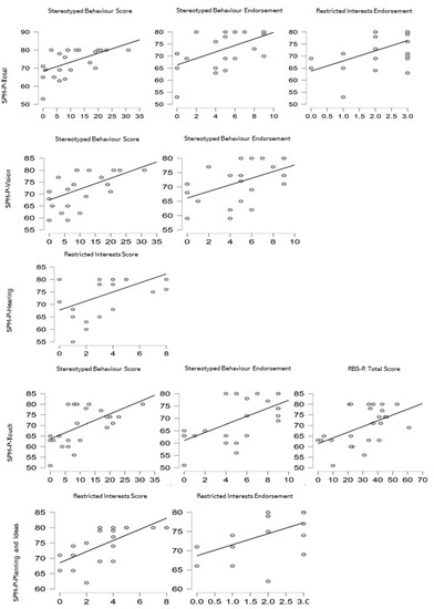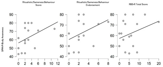 Considering only the SPD group (see Figure 2), some significant correlations were found between SPM-P- Body Awareness and Ritualistic/Sameness Behaviour Score (rho = 0.558, p = 0.025), Ritualistic/Sameness Behaviour Endorsement (rho = 0.490, p = 0.054) and RBS-R Total Score (rho = 0.504, p = 0.046).