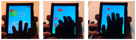 When the child enters the game, a button to be pressed to start appears. When they touch it, the time counter starts running, and the user can start popping balloons. The balloons move almost randomly around the screen: the lower corner on the left/right side of the screen is avoided, depending on which hand is holding the prosthesis. When the player clicks on a balloon, it explodes, making a sound that serves as feedback on the child’s action. Depending on the number of balloons popped, the level of difficulty of the game increases, maintains or decreases; this is done by increasing, maintaining, or decreasing the number of balloons presented in the screen as well as the speed at which they move. The game ends when one of the following occurs: the child has popped all the balloons or time is up; then, the score record is displayed. Figure 1 shows snapshots of a user playing “Balloons”.