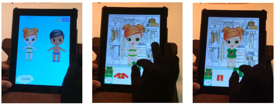 The rehabilitative objective, in this case, is for the child to be able to make the clamp (gripper) movement, that is, to grasp objects with the thumb and forefinger. To dress the character, the child needs to select the clothing using a pincer movement, as if picking it up. This movement will enlarge the garment. The child must then drag the garment to place it on the character. When the child places a correctly sized garment in the correct place, a sound is emitted as feedback on his action. In this case, there is no time limit, and no scores are assigned, according to the expert suggestions. The aim is for the children to have fun dressing the characters so that this serves as training to improve their skills in the clamp movement meanwhile; nevertheless, the size of the pieces of clothing shown to each user (i.e., the difference between their size and the character’s size) is adapted based on the information stored in his model regarding his ability with the clamp movement (needed to resize pieces). This ability may vary over time, as the user becomes more skilled; when this occurs, the information regarding this is adapted in the user model, accordingly.