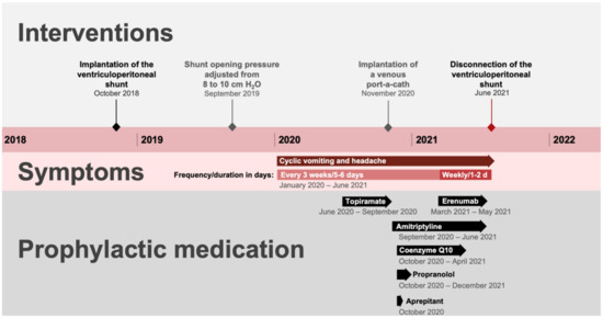 MRI scans in August 2020 showed a minimal increase in the lateral ventricular width compared to the previous scans and a constant midline shift of 3 mm. The tip of the VP shunt was still located in the right thalamus. However, the previous treating physicians assumed that this option was rather unlikely given the severe symptomatology, relatively unremarkable MRI findings, and repeated unremarkable external neurosurgical evaluations. The possibility of a VP shunt dysfunction and chronic overdrainage was discussed again with the parents in our SPPC early after the ineffectiveness of previous prophylactic drug interventions. The shared decision of parents and clinicians was to exhaust all pharmaceutical options prior to surgical intervention in the VP shunt. After the failure of classical prophylactics in the treatment of CVS and migraine, a trial of therapy with a monoclonal antibody against the CGRP receptor was discussed with the family, consistent with the Pediatric and Adolescent Headache special interest group of the American Headache Society recommendations for the treatment of refractory migraine [15]. The first trials with a subcutaneous administration of 35 mg erenumab (1.58 mg/kg body weight) were performed in March and April 2021. The administration was well tolerated with no side effects. Under this regimen, there was an increased frequency of attacks (3–4 per month) but a decrease in the duration (1–4 days). In May 2021, the family agreed to a final therapy trial with 70 mg of erenumab (3 mg/kg body weight). Again, there was no beneficial effect on the recurrent episodes of headache and vomiting. A timeline of interventions, symptoms, and prophylactic medications is given in Figure 1.