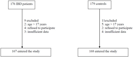 The study population included 335 individuals: 167 IBD patients (49.9%) and 168 controls (50.1%). Of these, 93 IBD patients (56%) had CD and 74 patients (44%) had UC. Most of participants were female (72.1%) and their age >10 years (51.5%). Other demographics of the study participants are shown in Table 1. Among the demographic characteristics, only age group > 10 years old (OR 1.040; 95% CI 1.012–1.069, p < 0.0001) showed a significant relationship with IBD and control patients. The characteristics of the cases and controls are described in Table 2.