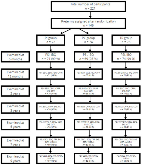 - Milgrom, J.; Martin, P.R.; Newham, C.; Holt, C.J.; Anderson, P.J.; Hunt, R.W.; Reece, J.; Feretti, C.; Achenbach, T.; Gemmill, A.W. Behavioural and cognitive outcomes following an early stress-reduction intervention for very preterm and extremely preterm infants. Pediatric Res. 2019, 86, 92–99. [Google Scholar] [CrossRef] [PubMed]