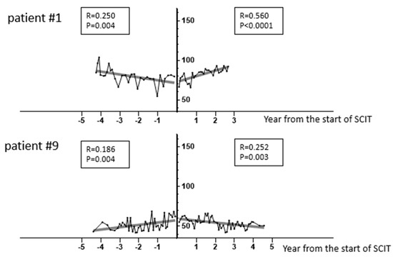 A total of 16 patients were eligible for the study, and we analyzed 1158 spirometric measurements after excluding 7 outliers out of the total 1165 by the ROUT method with a false discovery rate <1% [23]. Table 1 summarizes the annual change in MEF50% predicted before and during SCIT in all patients. In accordance with our definition, 8 patients (50%) were classified in the improving group (Group I) and 8 (50%) in the declining group (Group D). Patients from Group I and Group D, showing pulmonary function trajectories (Figure 1). The subjects were classified in the same groups based on annual changes in %FEV1 (Table 2). However, 3 subjects—#2, #14, and #16—were classified into the different groups by the changes in FEV1/FVC (data not shown).