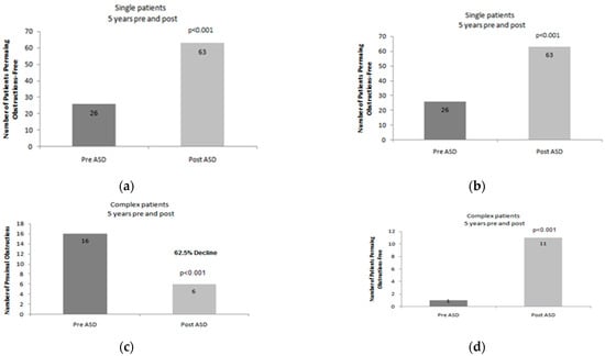 Figure 1a,b). When the other two subcategories of revision are encountered, namely dysfunction of the peritoneal catheter and infection, there was an inability to establish a statistically significant difference when the data that refer to the time period before and after ASD insertion were analyzed.