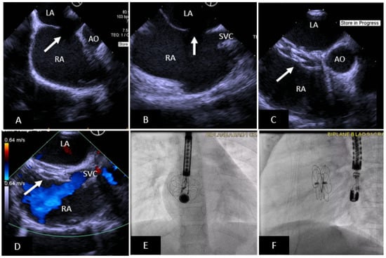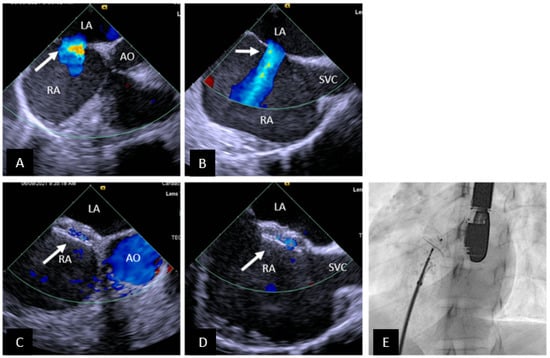 - Medford, B.A.; Taggart, N.W.; Cabalka, A.K.; Cetta, F.; Reeder, G.S.; Hagler, D.J.; Johnson, J.N. Intracardiac echocardiography during atrial septal defect and patent foramen ovale device closure in pediatric and adolescent patients. J. Am. Soc. Echocardiogr. 2014, 27, 984–990. [Google Scholar] [CrossRef] [PubMed]