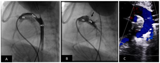 - Bauser-Heaton, H.; Qureshi, A.M.; Goldstein, B.H.; Glatz, A.C.; Ligon, R.A.; Gartenberg, A.; Aggarwal, V.; Shashidharan, S.; McCracken, C.E.; Kelleman, M.S.; et al. Comparison of Patent Ductus Arteriosus Stent and Blalock–Taussig Shunt as Palliation for Neonates with Sole Source Ductal-Dependent Pulmonary Blood Flow: Results from the Congenital Catheterization Research Collaborative. Pediatr. Cardiol. 2022, 43, 121–131. [Google Scholar] [CrossRef]
